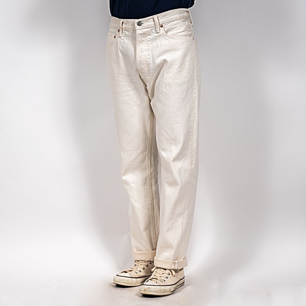 ホワイトデニムはインディゴやブラックに比べて固く感じます。サイズは、きつすぎないゆとりあるサイズを選んでください。
