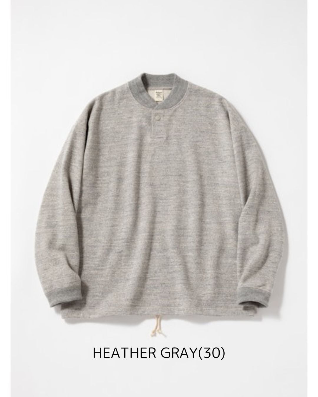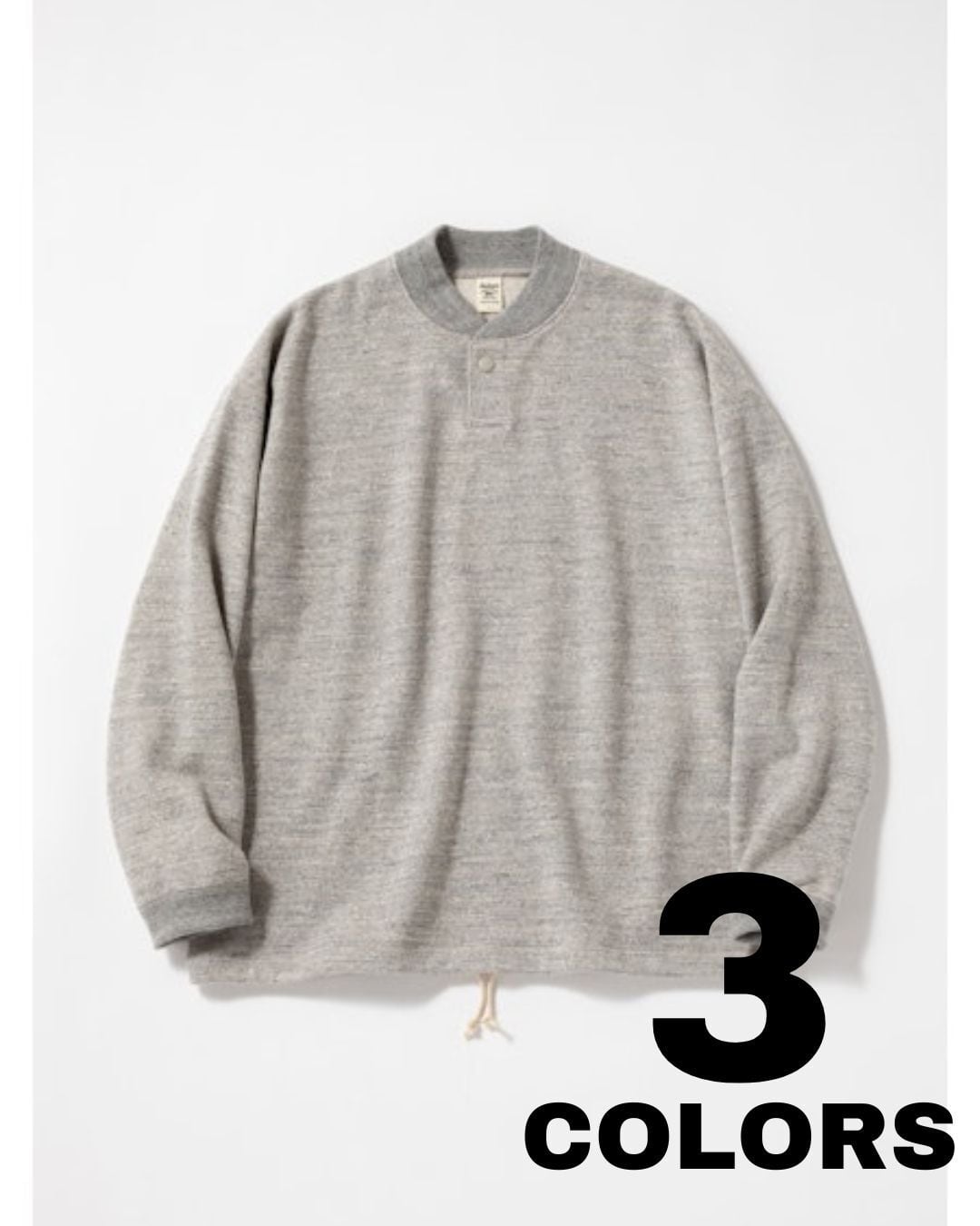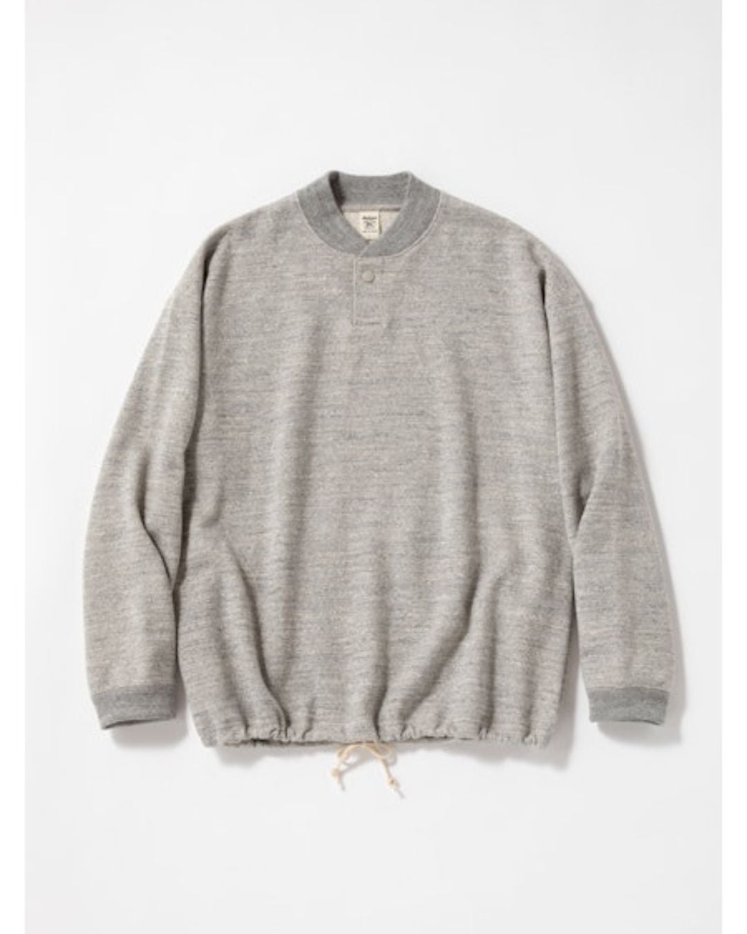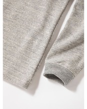 太番手の国産糸を使用し日本国内で編み立てた肉厚なGG(ガラガラ)裏毛素材のGJネックです。デザインは野球場で働くスタッフが着用していたグラウンドジャンパーを参考にGG裏毛の肉厚感、ボリューム感とのマッチングを考えてゆったりとした肩周りと裾にかけてシェイプせず自然に落とした設計にしました。また襟先のボリュームが落ちないように職人の技術で丁寧にいせ込み馴染みの良い首元になる工夫をしました。裾は紐で調節可能です。Baseballユニフォームのような首元のデザインと初秋から着用できるゆとりのあるシルエットが特徴です。
