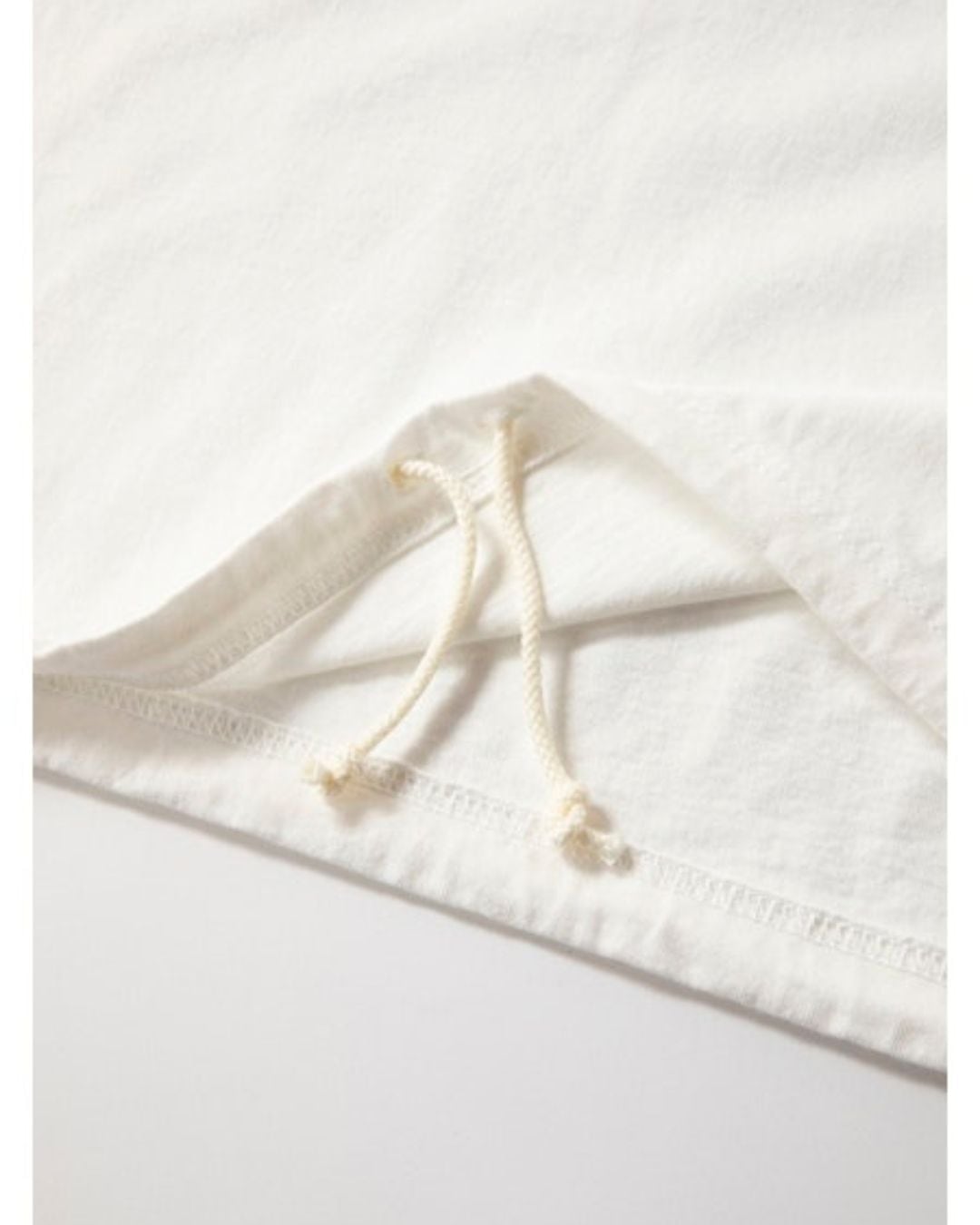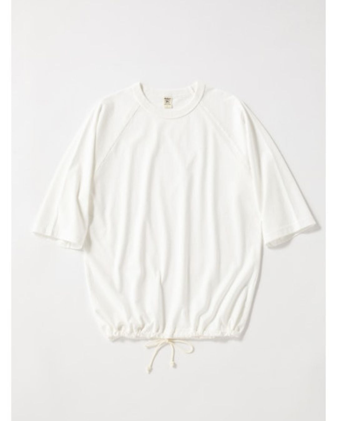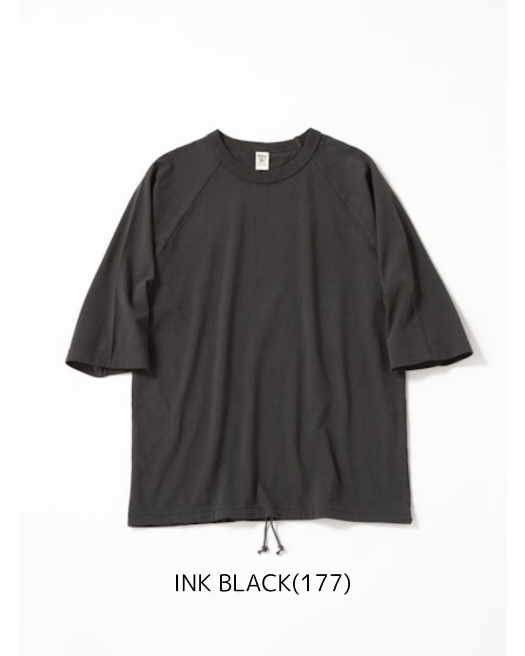 乾燥感がありザラッとした肌触りが特徴のアメリカ綿を空気紡績によって粗野な表面感に仕上げたヒモハーフスリーブリブTシャツです。T‐Shirtを着用する期間が長くなる中、気温や湿度に負けないように開発したゆったりとしたシルエットと珍しいラグランスリーブ、生地と肌の間に隙間を作り快適な着心地を作る裾の調節コードが特徴です。