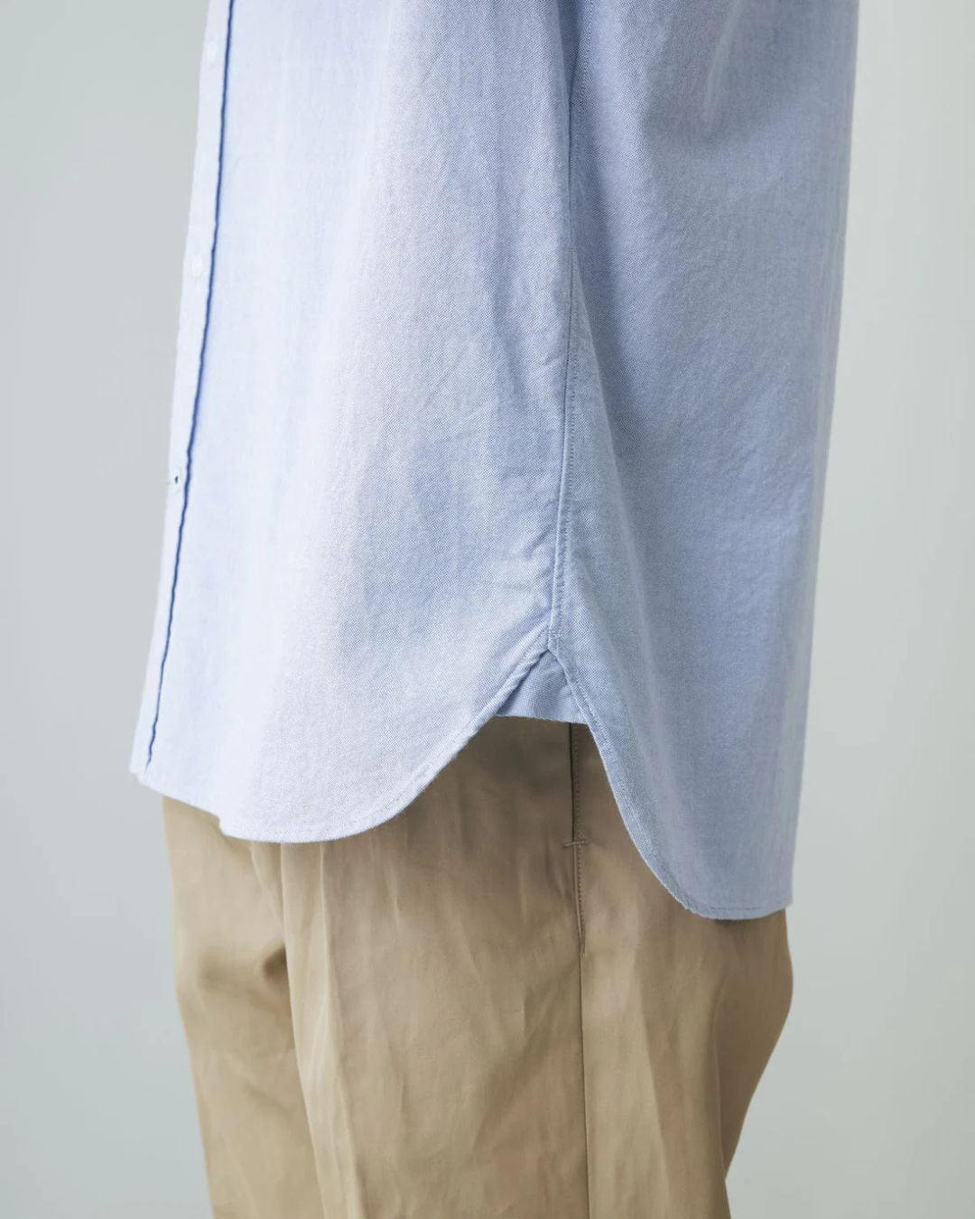 3 cm 間に 24 ~ 26 針の繊細で美しいステッチワークで縫製しています。高級なシャツに用いられるフラシ芯と呼ばれる綿 100 % の芯地を、襟やカフス、前立てに使用。立体的でソフトな衿のロールや表地に添ったソフトな膨らみのあるカフス、前立てに仕上げています。上質で美しい輝きの白蝶貝釦をクロス付けしています。台衿釦は釦止め糸が裏に出ないように、手付しています。