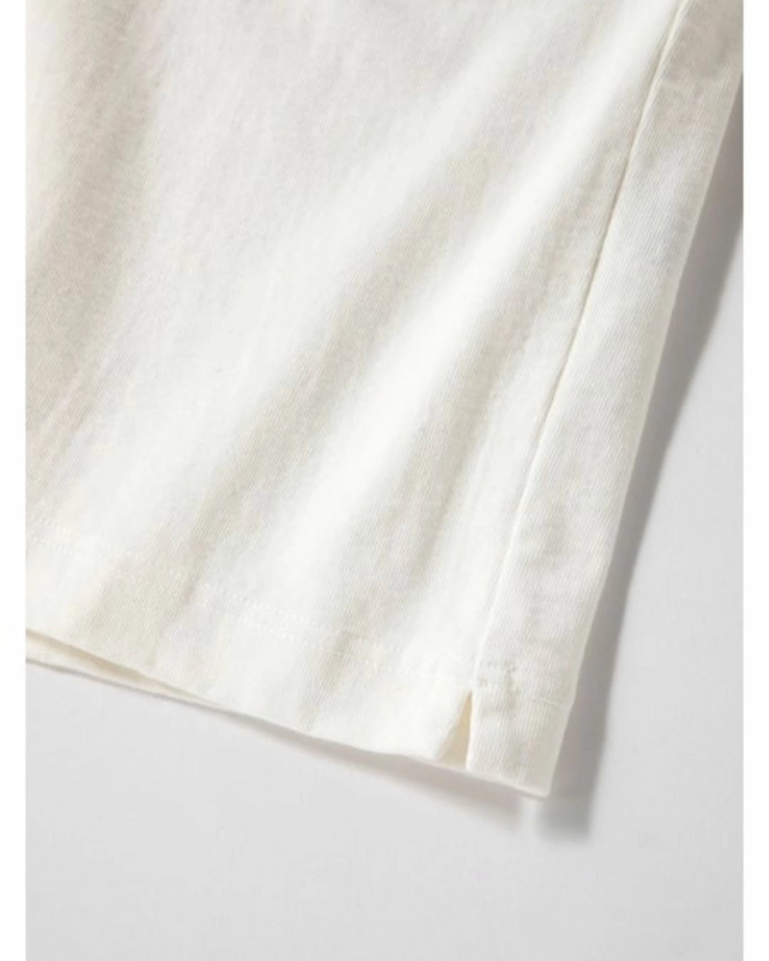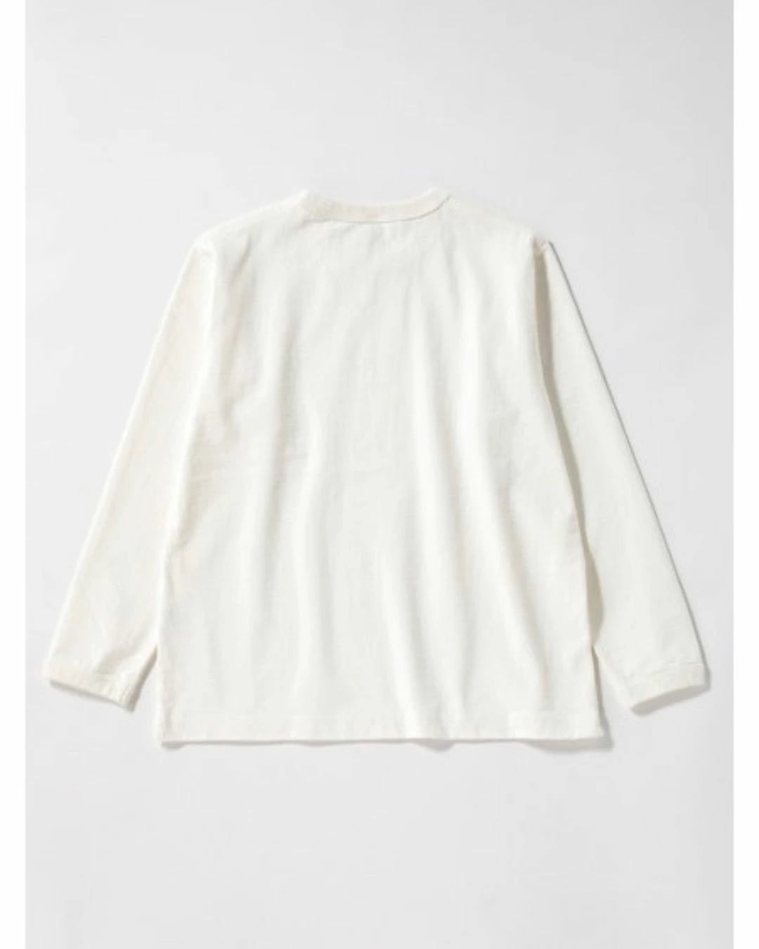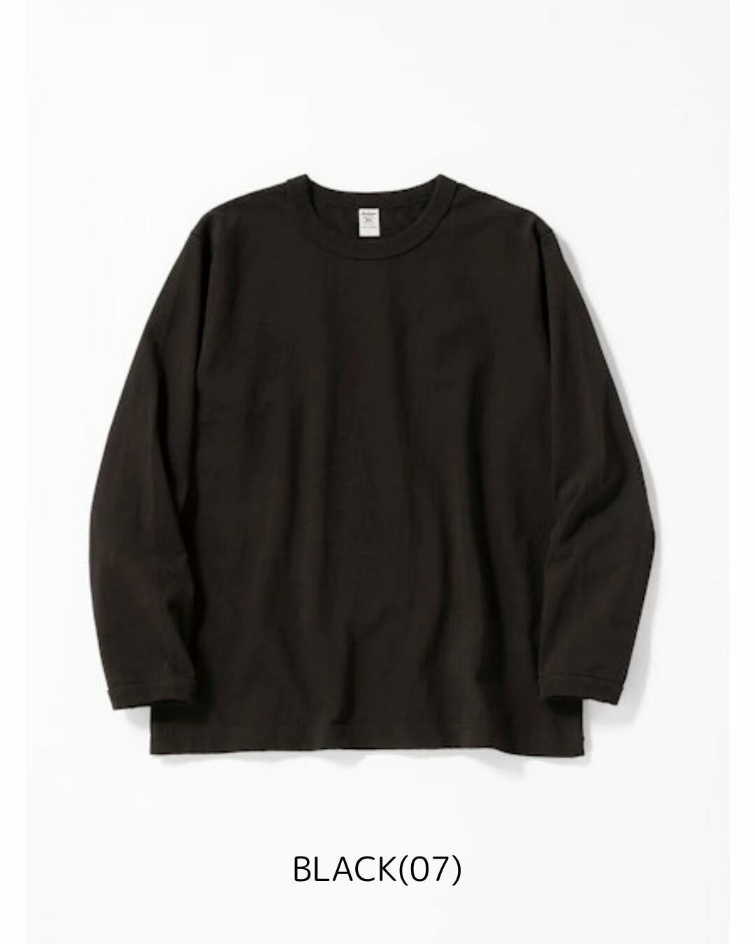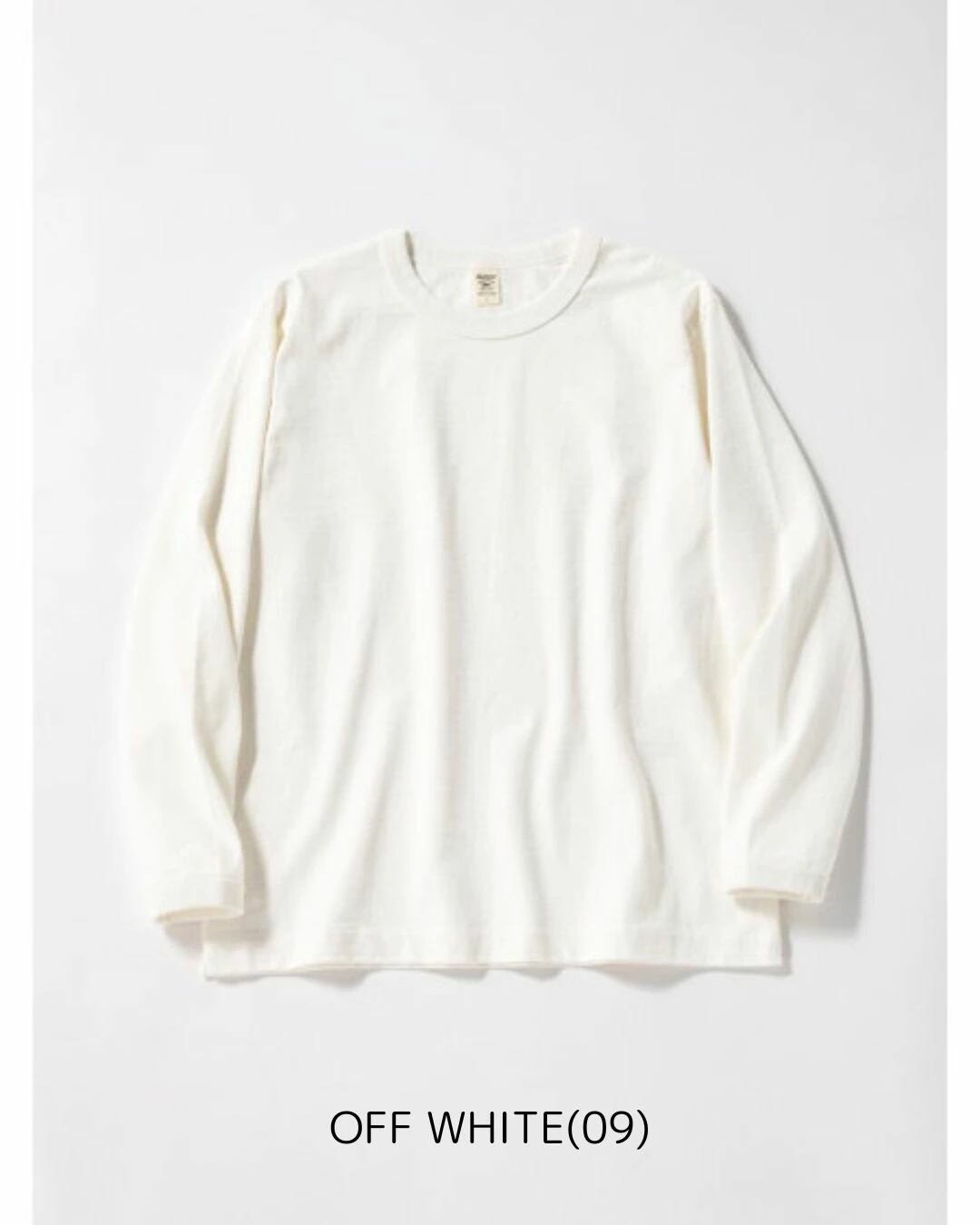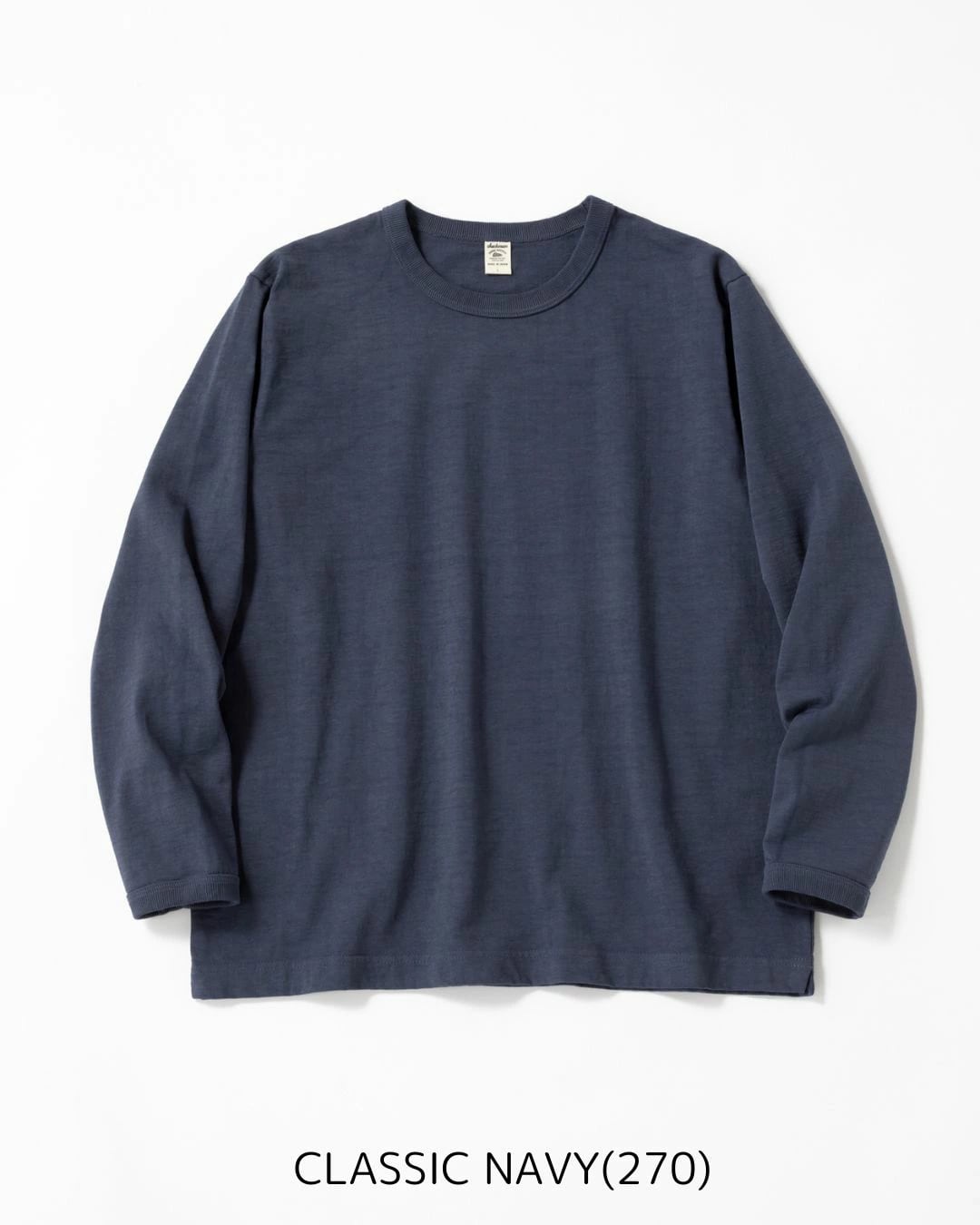Dotsume/High-density jersey fabric is an extra-thick material of approximately 11.5 ounces, made of American cotton and knitted by loop-wheel knitting machine. As it's knitted very slowly, each knitting machine can only produce about 30 pcs for T-shirts per day, but it is characterized by its ability to evenly pack the yarn and its resistance to shrinkage and distortion even after repeated wear and washing. This long-sleeved T-shirt is made with ribs as thick as a sweatshirt to match the body fabric, creating a well-balanced overall look. It has the advantages of being non-transparent and sweat stains are less noticeable, and its firmness makes it less likely to cling to the skin, making it comfortable to wear. The neck is made with a binder to increase durability. Relaxed Fi