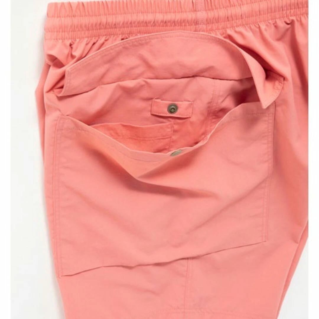 エアージェット織機で織り上げた光沢のないフルダル糸を使用したベンダーショーツです。肌触りが滑らかで帯電や透けも防止、エアリーで発色性が良いのが特徴です。デザインはBaseballスタジアムでドリンクやスナックを販売する売り子が穿いていたショーツをイメージ。裾の身返し、インナーポケット付きで出し入れしやすいカーゴポケット等、ベンダーとして使いやすい機能を加えました。