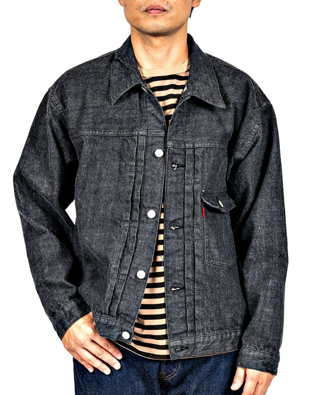 大きいサイズのGジャンを、幅の狭いセルビッジデニムで作るため、背中に割りのある仕様。